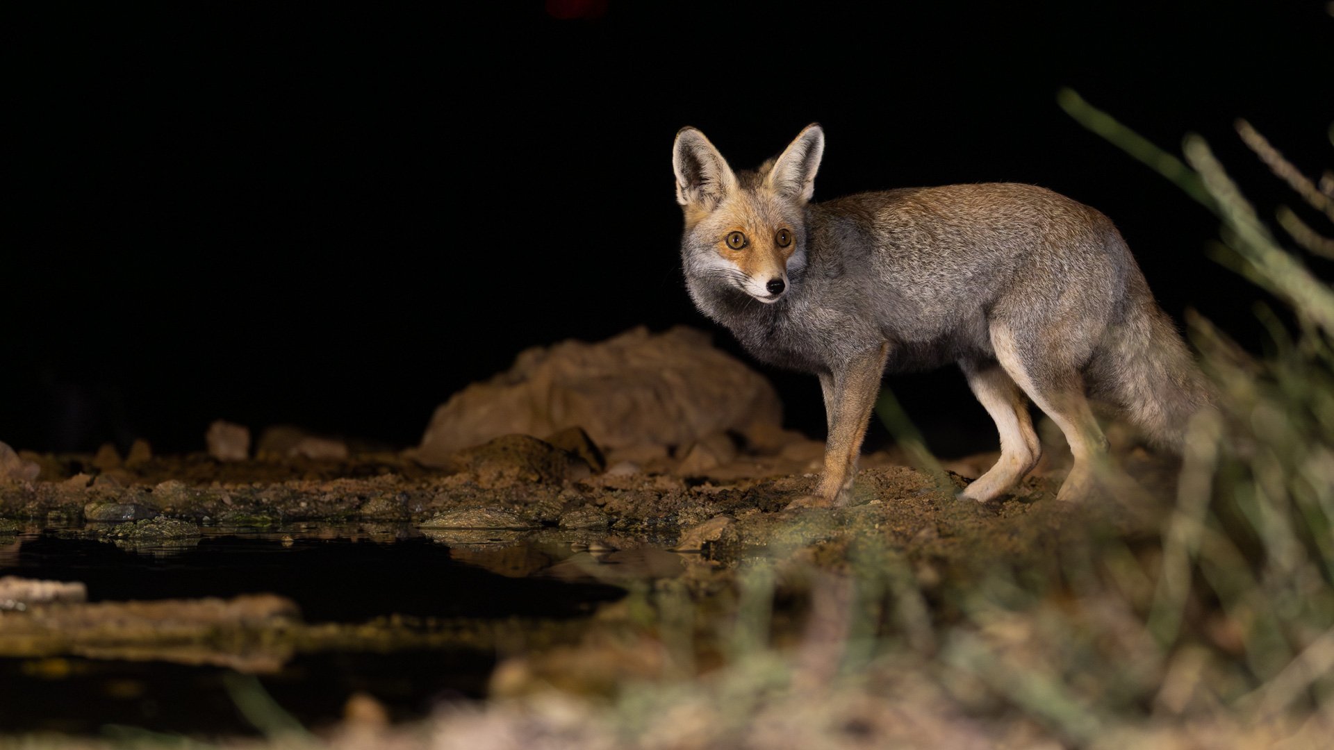 Sitting in a hide overnight, making as little noise and movement as possible, is something of an endurance test. Not much can happen for hours, and then suddenly something appears, and you are witness to an intimate scene with wild animals at a proximity that would be impossible without them being unaware of your presence. It is truly exhilarating. Celia’s Hide in Azuz is well-known as a spot for observing and photographing desert wildlife that come to drink at a small pool. This was my first visit. During the night the pool was visited by jackals, a herd of onagers, a fox and a porcupine.