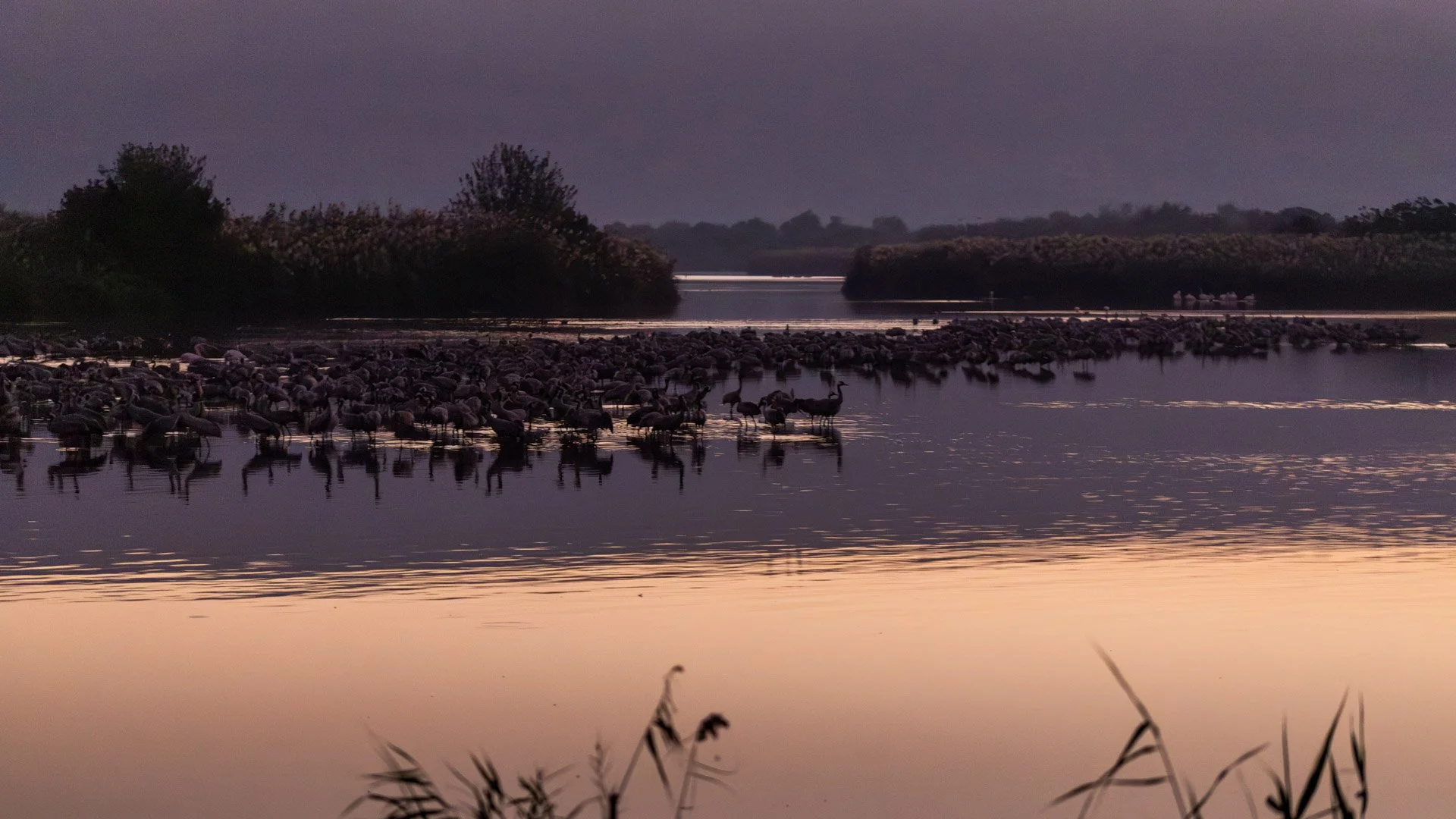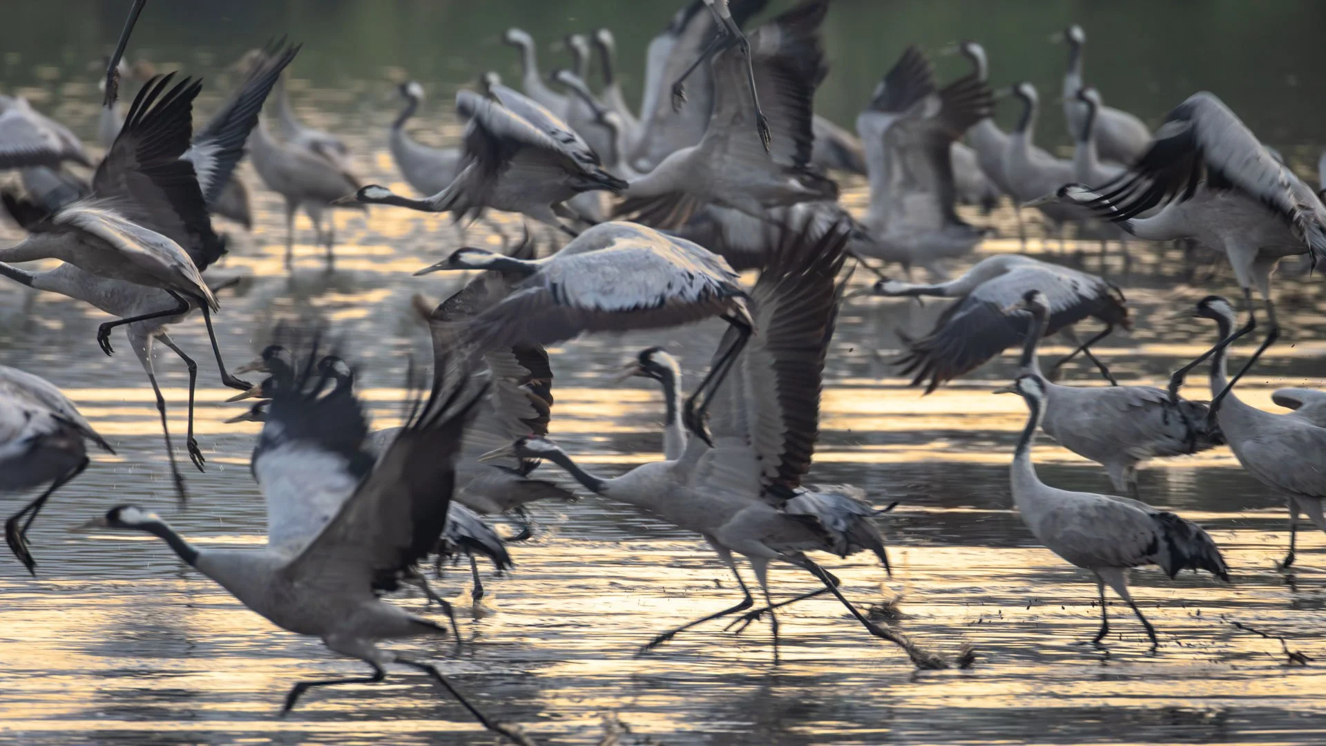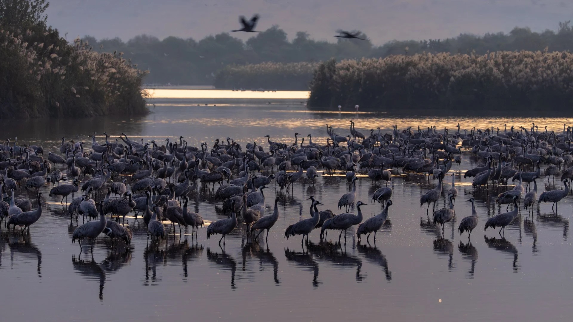 As the light increases, the cranes start to leave the lake and make their way to the nearby fields to feed.