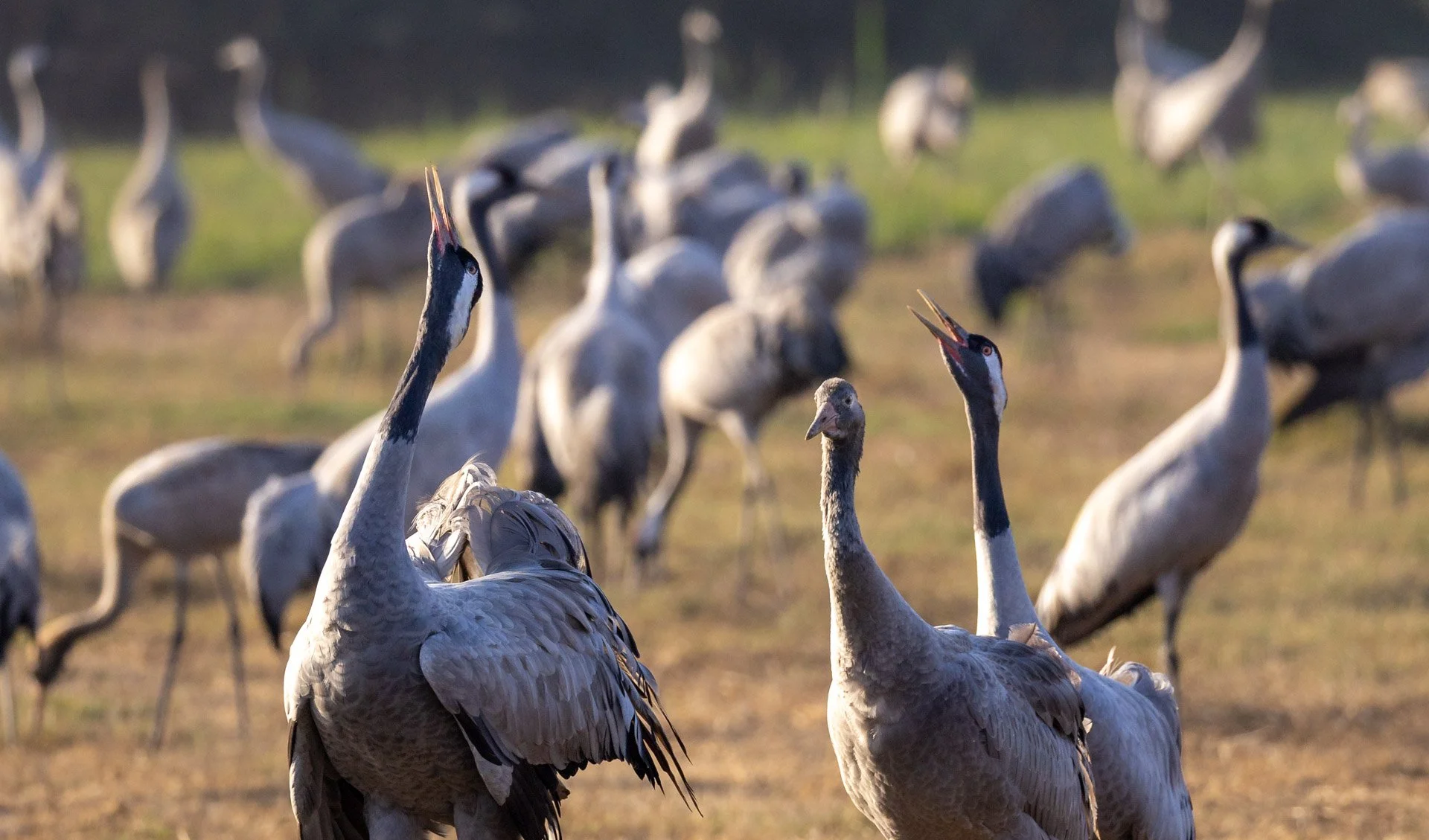 The cranes gather in the fields to feed