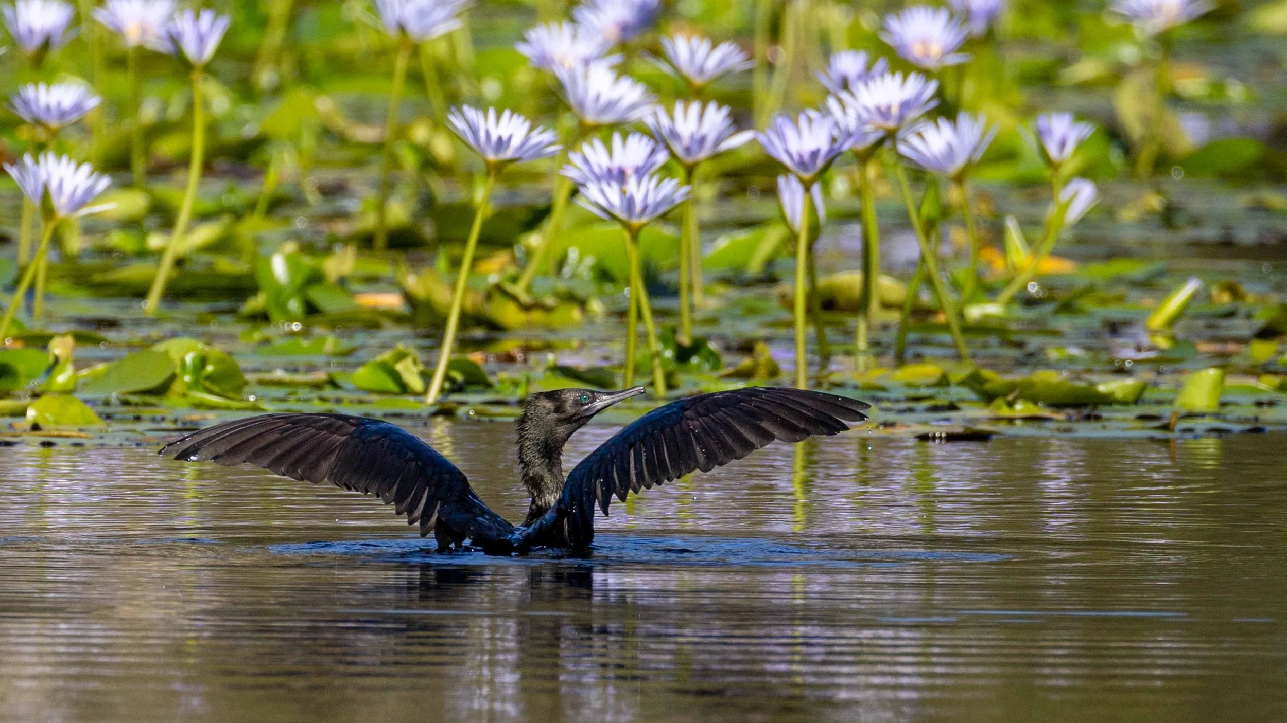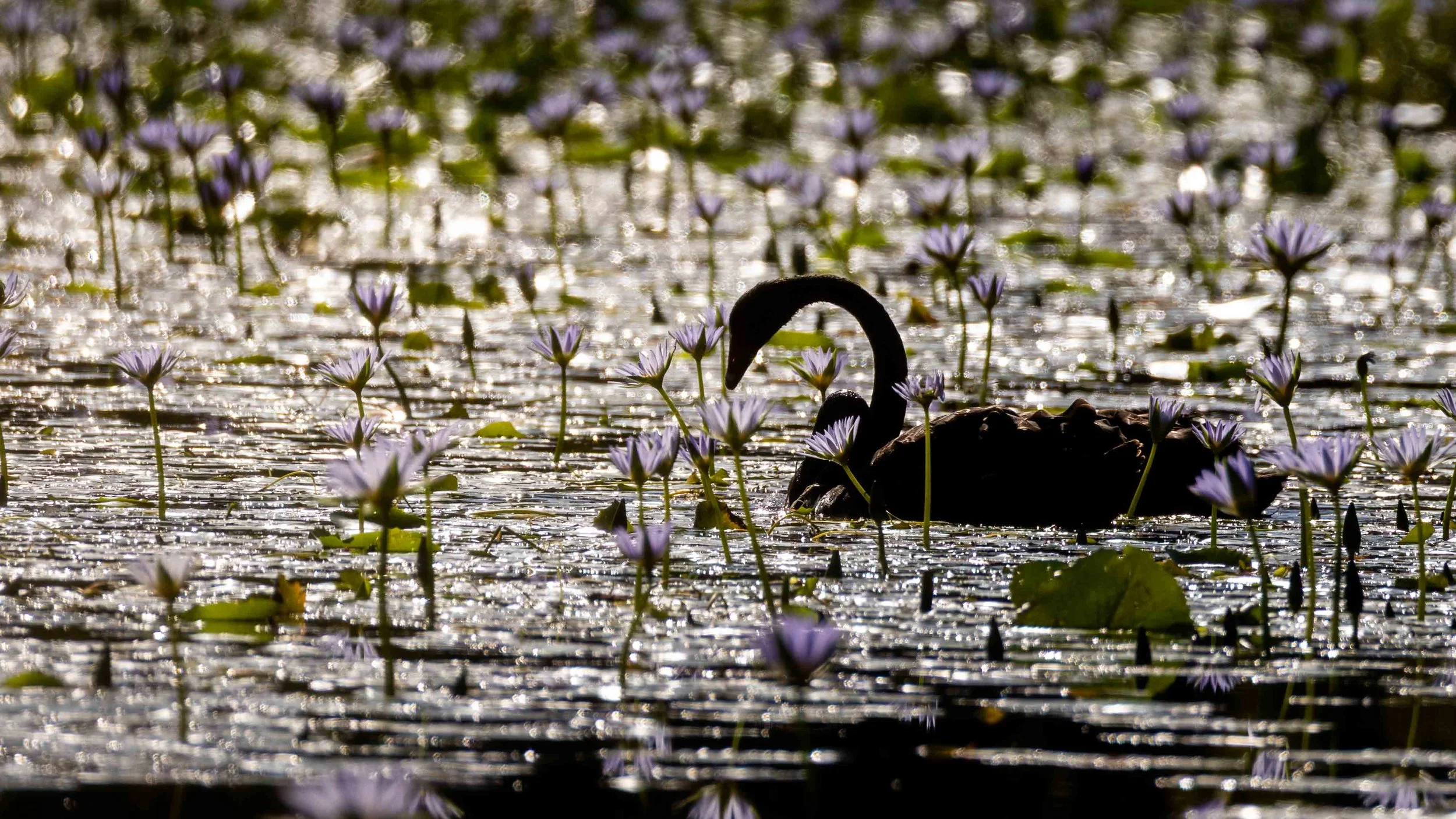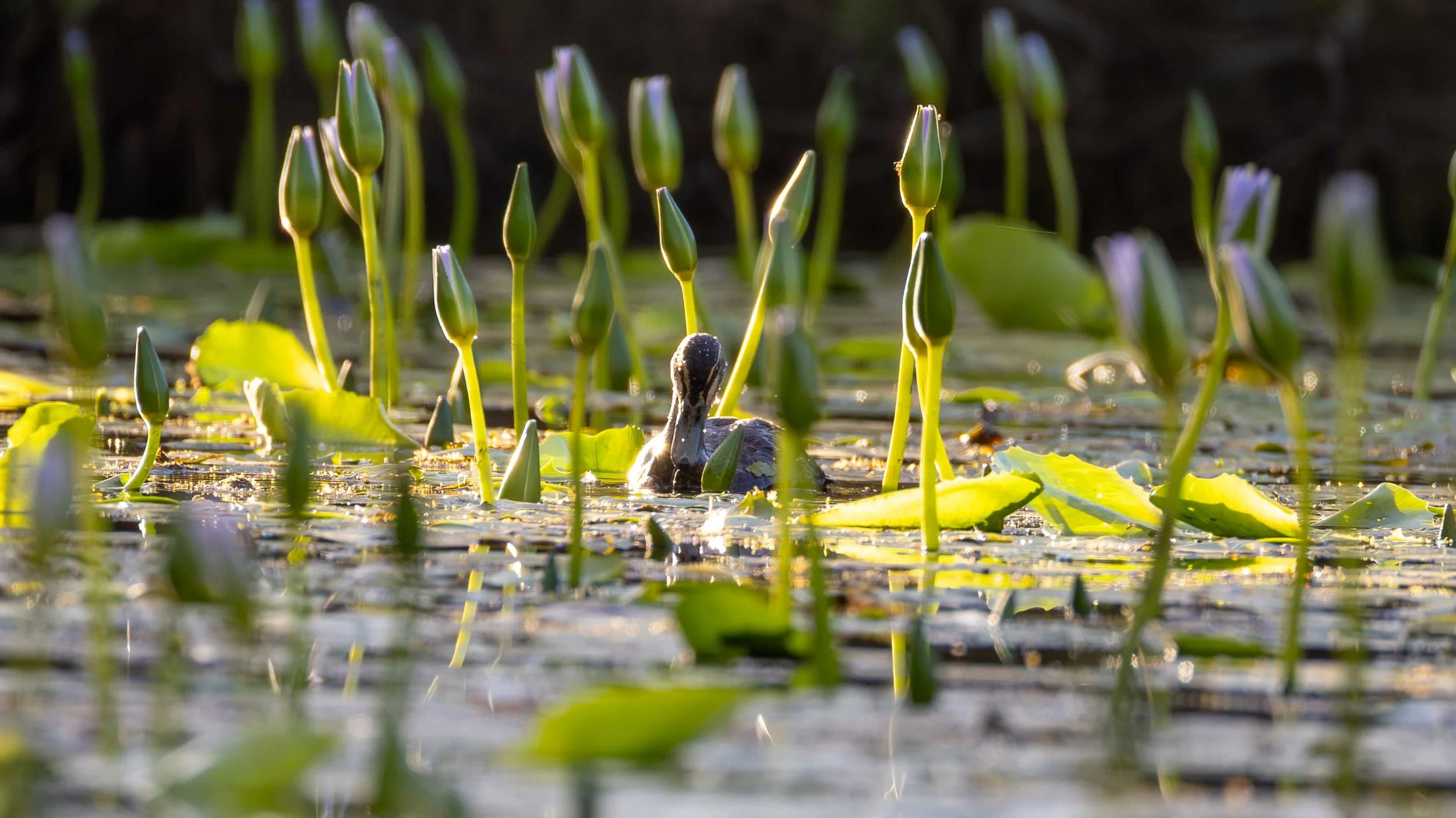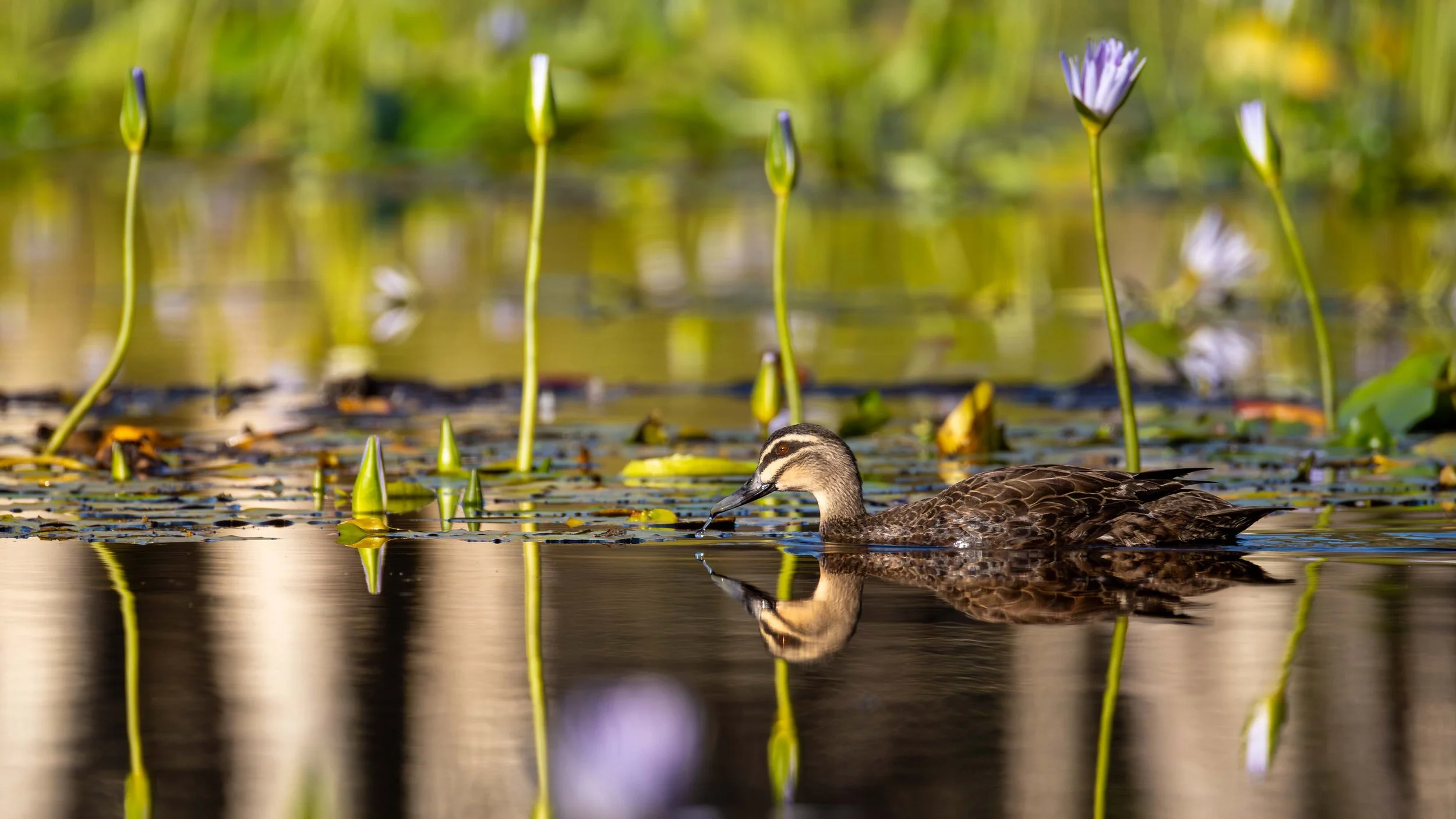 Early morning the waterlilies are closed. As the sun climbs higher, they open for pollinators. Pacific Black Duck